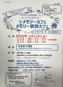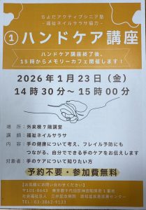 2026年1月23日(金)、社会福祉法人三井記念病院 認知症疾患医療センターにて「ハンドケア講座」、及び「メモリーカフェ、メモリー家族カフェ」を開催します。